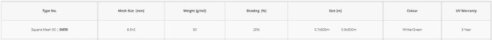 Square Mesh 50 (SM50) is a basic type, It is lightweight and ideal for narrow width netting of Pest Protection