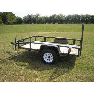 Standard Features: Frame - 3 x 2 Angle. Top Rail and Uprights - 2 x 2 Angle. Tongue - 3 x 2 Angle, A-Frame  (3" Channel Wrapped Tongue on 14`). Heavy Duty Checker Plate Fenders with Steps. Dexter 3500# EZ Lube Axle. New 175/80 13" Tires. Treated 2"x 8" Pine Floor. Spare Tire Mount. 2" Coupler. 2K A-Frame Jack. Safety Chains. Tie Downs. Removeable Rear Gate. 2950# GVWR. Popular Widths:  5`, 6`, 77". Popular Lengths:  8`, 10`, 12`, 14`.