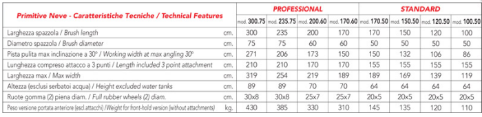 Mechanic or hydraulic driven. Recommended for fresh snow clearance up to 15-20 cm high. Wheels (2) made of full rubber diam.mm. 200x50 mounted with fork on bushing made of ppn, capacity kg. 350 each.
