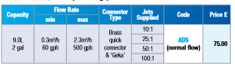 Fill the Static Dilutor bottle with liquid feed, select the appropriate jet and connect to the water supply. As water passes through the dilutor head it draws up a ratio of liquid feed which mixes with the water. Designed to be filled, put near the tap, and then not moved until it is emptied. Max operating pressure 2.5 bar.