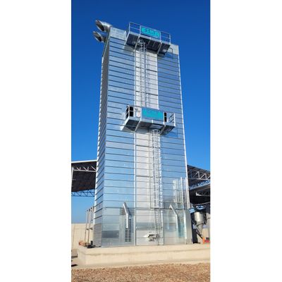 The drying is performed by means of hot air cross currents passing through the grains, which dry as they drop towards the bottom.