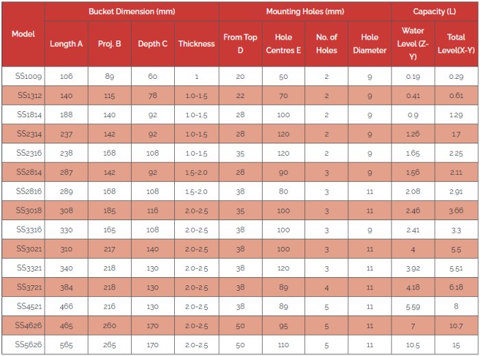 - Minimum bucket spacing: bucket depth ”C” +5mm and minimum bucket spacing: bucket projection “B” +25mm.