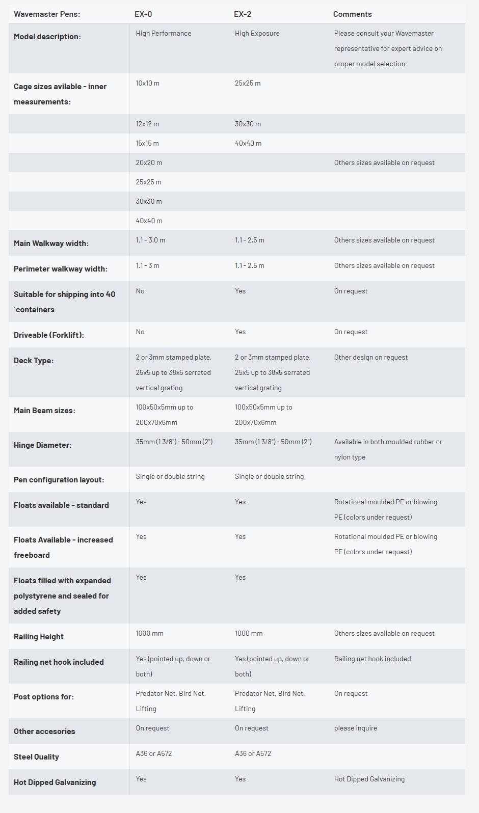 Steel pens are suitable for sites with moderate exposure and strong tidal currents. Combined with a global sales and service network, the Wavemaster Steel Pens are a well proven concept. The large number of pens currently in use, operating under diverse wave and wind conditions world wide, has demonstrated the reliability of the Wavemaster design.