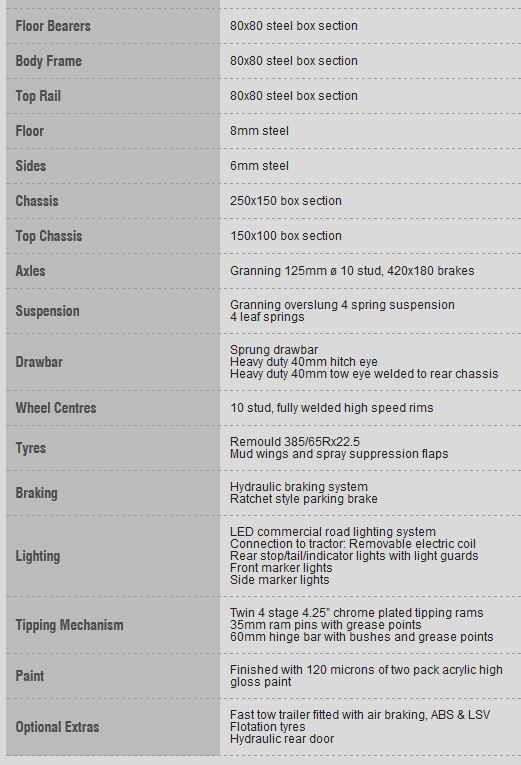 Standard features include: Chrome plated tipping rams, sprung drawbar, heavy duty 40mm tow eye, heavy duty tow eyes welded to rear of chassis, inspection ladder, mud wings, spray suppression flaps, ratchet style park brake, rope hooks on every body panel, LED commercial road lighting system with front, side and high level rear marker lights, stop/tail lights and flashing warning light, rear light guards and a hydraulic braking system.