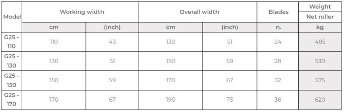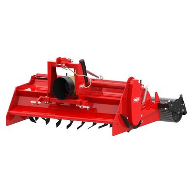 Basic machine: Universal 3 point linkage Cat. 1 & 1s. Single speed gearbox 540 rpm PTO. Lateral transmission driven by chain in oil bath. Automatic chain tensioner on spring. Removable flanged rotor. 4x Spade blades per flange. Wearing steel protection counter-flanges. Working depth adjustable by crank handle. Rear selector rake mounted on lateral springs. Cardan shaft with shear bolt torque limiter SB type (1”3/8 Z=6 tractor side yoke).