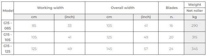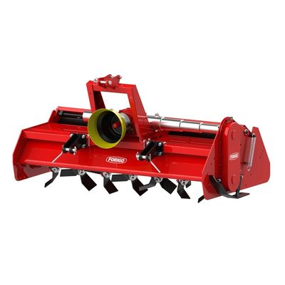 Basic machine: Universal 3 point linkage Cat. 1 & 1s. Single speed gearbox 540 rpm PTO. Lateral transmission driven by chain in oil bath. Automatic chain tensioner on spring. 4x Spade blades per flange. Wearing steel protection counter-flanges. Rear selector rake mounted on lateral springs. Rear adjustable hood. Working depth adjustable by crank handle. Cardan shaft with shear bolt torque limiter SB type (1”3/8 Z=6 tractor side yoke).