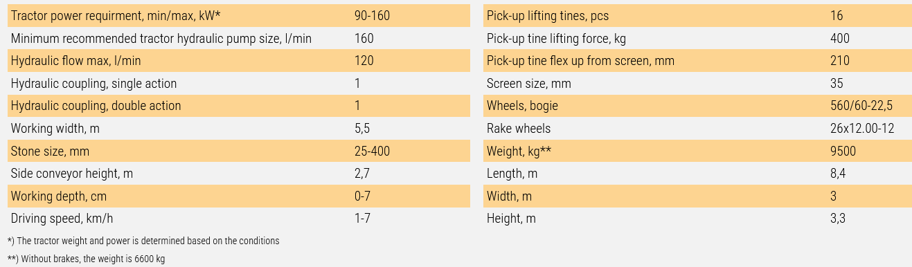 The centre conveyor has a very sturdy structure and lifts stones from the ground. The kinetic energy of the stones is dissipated before arriving at the side conveyor, which has a lighter structure and is equipped with spring steel rods and a rubber mat. Both conveyors effectively sieve dirt off the stones.