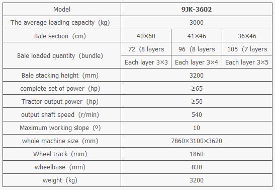 The 9JK-3602 straw picking up and stacker is a forage collection machine. It is traction by a tractor, one driver to operate, the driver without leaving the cab can complete the automatic pick up, set, transport and stacking all the processes, instead of heavy manual pick up, stacking work. This product picks up the speed of up to 15 km / h, the transport speed of up to 32 km / h, according to the different transport distance, 2500-5000 bales one day to complete the pick-up and stacking.