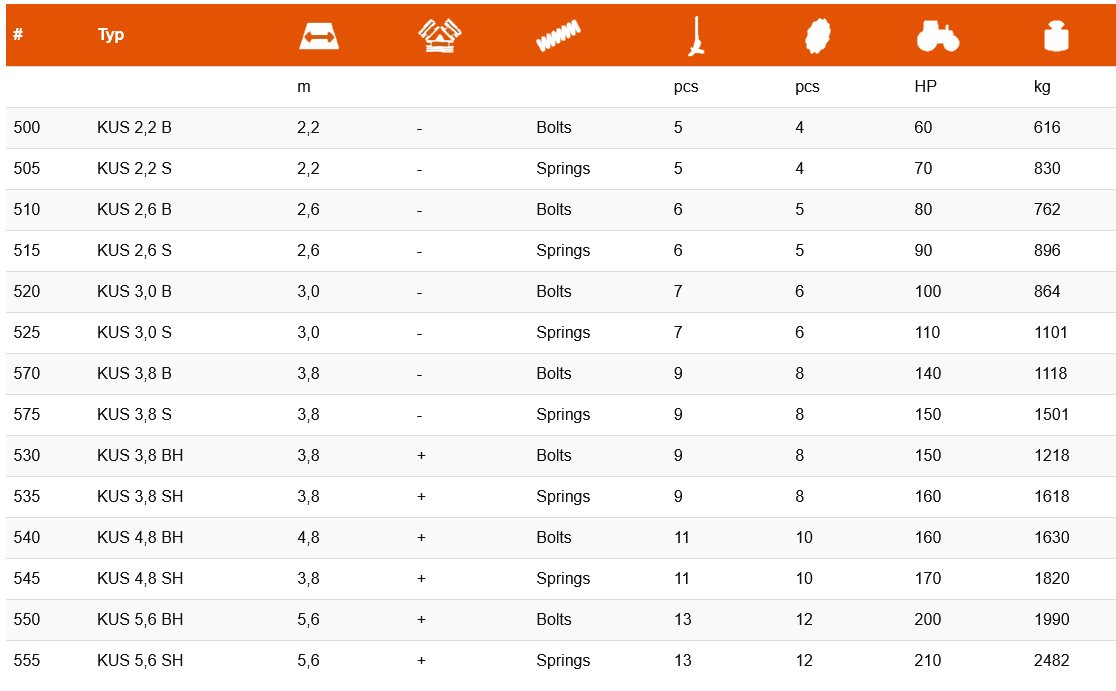 The KUS cultivator comprise a wide range of machines designed as a robust frame with two beams. The type of machines is used for pre-sowing and pre-planting cultivation as well as for stubble cultivation as they achieve excellent results thanks to perfectly performed undercutting and mixing of post-harvest remains. Two rows of tines, alternating settings of of 465 mm diameter notched discs and a wide range of rollers to choose from guarantee high quality of post-harvest cultivation.