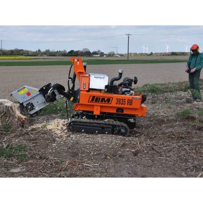 Fully Hydraulic Stump Grinder on Crawler Track with Professional Equipment. Professional, fully hydraulic stump grinder for landscapers, gardening companies, and rental stations. Ease of use through remote control or – alternatively – through stationary control. Ideal machine for small to medium jobs or work with extremely limited access. Compact design with small machine dimensions. Machine width only 79 cm. Good off-road capabilities thanks to hydraulic traction drive as crawler track or wheel chassis. Smallest JBM stump grinder with gasoline engine as fully hydraulic machine. Extremely large swivel range. Weight approx. 900 kg.