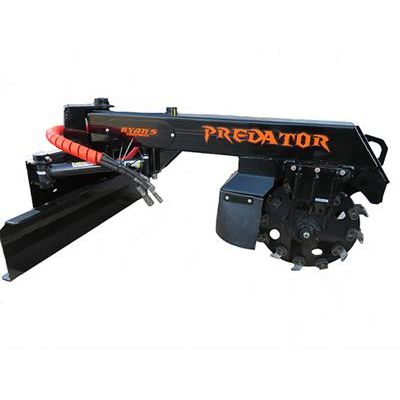 The Predator Stump Grinder, manufactured by Ryan’s, is designed for high flow, high horsepower skid steers. It is built for demanding high production use and features a heavy duty bulldozer style push blade, simple hydraulics, and allows the operator to grind in the comfort and safety of their cab. An optional chip curtain constricts the flying debris. This means less clean up time and it protects the surroundings! The curtains can be folded back for transport.