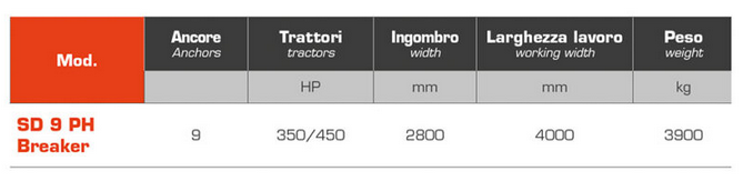 Standard Equipment: 9 anchors with quick release hoes + explosures. Two-section closure – road size 2800 mm. Hitch CAT IV. Depth wheels. Clod containing sides. Light bar and tables. Adjustment of the position of the rollers with a centralized patented system.