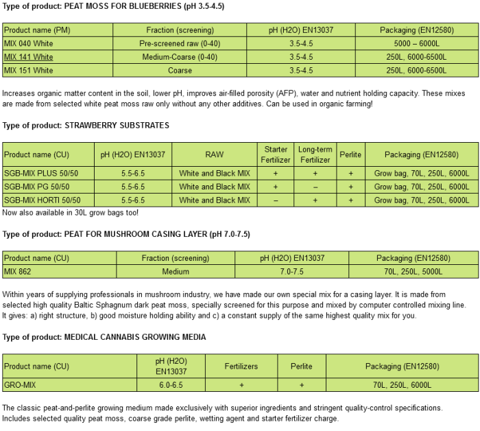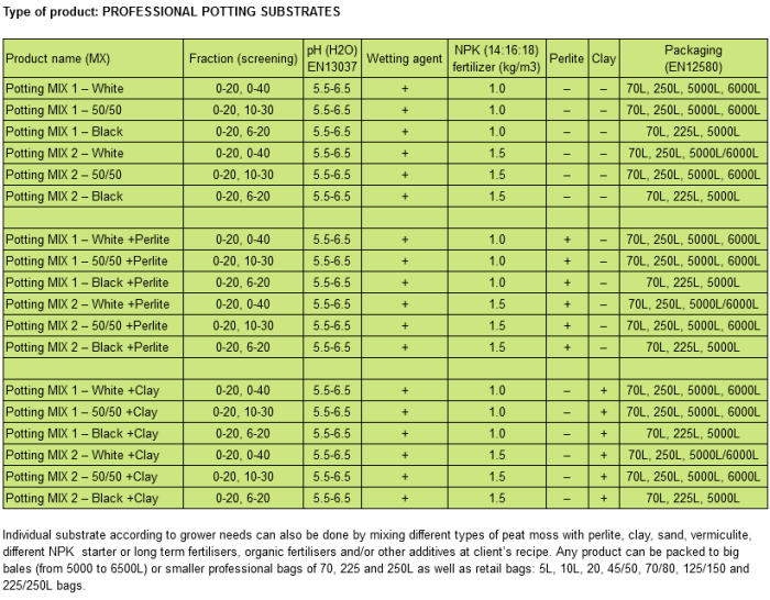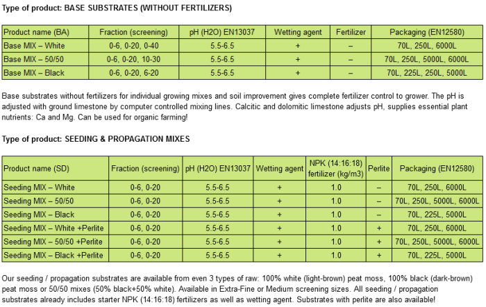 Our company offers Professional Base Substrates (pH adjusted peat moss), ready to use Seeding and Potting mixes, Special and Retail products, Mushroom Casing Soil, and even Individual substrates by client receipt.