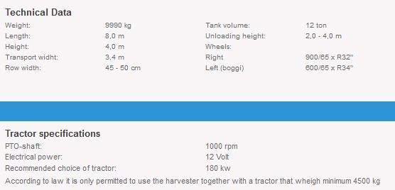 The two wheels; Trelleborg 600/65 x R34 gives the harvester a low ground preassure and a stabile operation. The harvester also has good ”opening skills” since the wheels are in line and the boggi axle is moveable sideways.