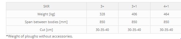 One-sided carried ploughs SUKOV type SKR are suitable for all types of soil after harvesting of grain and industrial plants. Adjusting elements of the first plough engagement and tillage depth are mutually independent, or set as fixed. Ploughshares are secured by screws that break if the share hits an obstacle. Each type can be equipped with coulters, disc cutters, and extension wings for the ends of moldboards. All types are equipped with graded mechanical vario plough body engagement system.