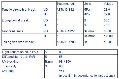 The 5-Layer technology in Sun Selector greenhouse films makes this greenhouse plastic among the highest quality in the world. What makes greenhouse plastic so effective is the complex chemical additives that give the plastic its unique properties such as Light diffusion, thermicity, stabilization against UV breakdown, blocking of ultra violet radiation, anti drip, anti mist and others. In addition, the films are often produced with more than one base resin, utilizing EVA, Linear Low Density PE, Metallocene resins and Barrier resins.