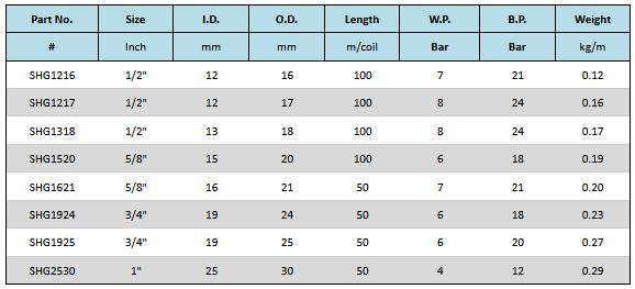 TUBE:Black PVC Compound. REINFORCEMENT: Synthetic Textile. COVER: Abrasion, Ozone And Weather Resistant Transparent Green PVC.