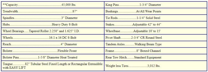 This model is designed for large farming operations and construction use. A flexible rear axle assembly equally divides the load on all tires. This feature gives improved flotation with maximum load. The TB450-1 is made of heavy structural steel rigidly reinforced at all stress points. The front axle is equipped with a heavy-duty rocking bolster. The truck-type steering mechanism has heavy steel trunnions, cold finished king pins, and thrust bearings. All points of wear have renewable bushings, and the hubs rotate on oversized tapered bearings.