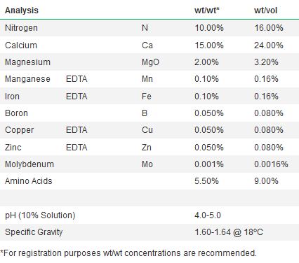 A suspension of calcium together with nitrogen, magnesium, trace elements and amino acids. Omex CalMax Gold contains high levels of calcium, coupled with magnesium and a full complement of trace elements which are formulated for easy uptake. Calcium is found in cell walls where it contributes to cell integrity and the overall strength of the plant. However, in addition, Omex CalMax Gold contains a range of selected amino acids specifically aimed at enhancing fruit set. Omex CalMax Gold is applied during flowering and these amino acids stimulate internal chemical pathways which promote fruit set, resulting in increased fruit yields. A combined Omex CalMax Gold (around flowering) and Omex CalMax (post fruit set) foliar programme gives a unique package which corrects calcium deficiency, improves fruit set, increases yield and helps improve firmness, storability, colour and finish in a range of fruits and vegetables.
