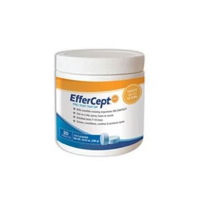 EfferCept SG is a teat dip for powerful killing, cleaning combined in one effervescent tablet. Enriched with SoftGuard “SG” conditioner, EfferCept SG penetrates to help protect and soften teats, skin, and udders. EfferCept SG quickly kills 99.999% of E. coli and Staph. aureus plus a broad spectrum of other mastitis causing organisms. The effervescent tablets dissolve in hard or soft potable water on farm. Dissolve 2 tablets per gallon of water