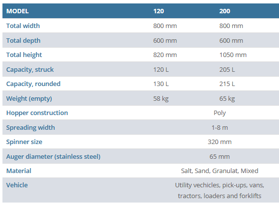 The Hilltip IceStriker 120-200 is a 12V electric salt and sand spreader designed for installation on pickup tailgates, vans, utility vehicles, tractors, loaders and forklifts. Polymer hopper and mounted parts in stainless steel give you effective protection against rust and corrosion. The spreader can spread all types of spreading material; bulk, bag, sand and gravel, and the horizontal auger and spinner disc has independently controlled motors.