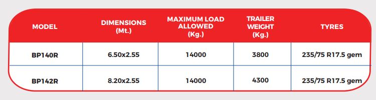 Platform floor in stamped steel sheet with inclined tail. Tandem axle with parabolic suspensions. Brake on both axles. Hydraulic or pneumatic brake. Hydraulic valve parking jack. Removable front side. Rear hydraulic ramps complete with support feet and side distributor. Rear steering axle. Front security closing. Adjustable parking stand. Galvanized tool box. Front and lateral winches or fastening holes. Lateral tensioners. Predisposition to bale supports. Lightening system.