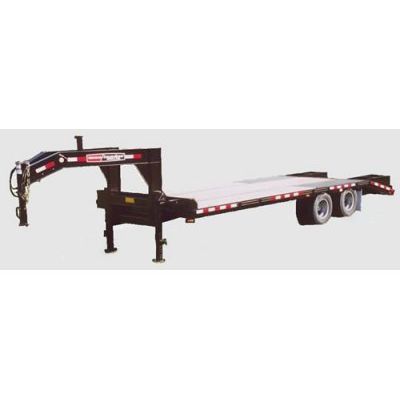 25,900 pound GVWR, available in tag along or goose neck with straight deck or beavertail. Features 2 speed double drop leg landing gear jack, lengths of 25, 29 and 33 feet, oil bath bearings, 16” radial tires and fold-over ramps. Fabricated pierced flanged beam frame for low floor height.
