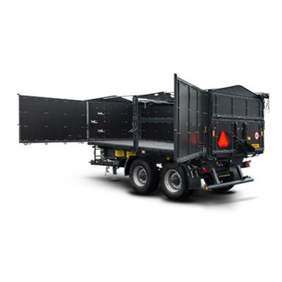 Trailer primarily designed for the transport of agricultural products and, in particular bulk agricultural materials such as cereals and corn. A central lock opens sideboards on all side.