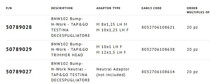 Tap & Go head for all types of brushcutters on the market. Manual line load. Simple, rapid installation. Adaptor not included for product 50789027, see the accessories on the bottom of the page and choose the neutral adaptor.