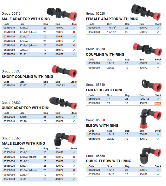 Tape fittings with the ring are for fast and simple connection, ideal for use in irrigation systems for connecting drip tapes. Increased middle part guarantees easy handling and assembling, and a long grip ring helps to pull the tape easily on the fitting. A simple solution for every situation, provided by a wide product range.