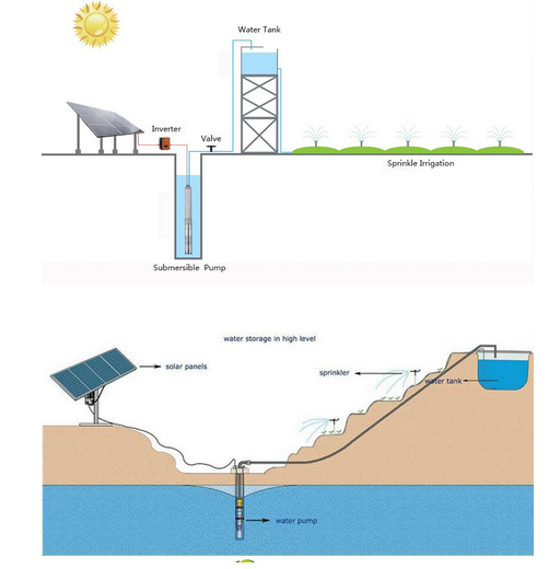 Solar irrigation system is mainly composed of pump, the solar pumping inverter, PV modules and irrigation devices such as sprinkler and dripper. The system will be powered by solar, instead of traditional diesel generator and mains power, which is no pollution, high efficiency and easy to install.