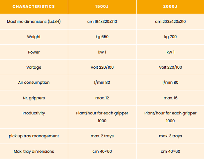 The TEA 1500J and 2000J transplanters are especially designed for the connection and integration to pot fillers equipped with carousels and to all machines with a chain transport system of pots. Each gripper is individually motorized and it is possible to pick up the plants from the side. The machine parameters and the programs entered can be saved on a USB memory.