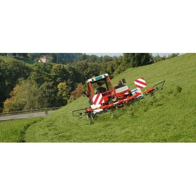 FELLA has specially developed three very light yet robust hay tedders for alpine terrain. Maximum safety is still ensured even on extreme slopes thanks to the low centre of gravity and the compact transport position. As with all FELLA hay tedders, the forage is picked up by the tines and turned gently without suffering damage. A light, loose and well-mixed layer of forage is created, all of top quality. The edge spreading device which is fitted as standard (TH 401 DN, TH 431 DN and TH 601 DN) helps you to avoid any loss of forage even under the most difficult of harvesting conditions or when working in hillside lines. Using the spreading angle adjustment system, it is possible to adjust the rotor pitch to three different positions. This provides you with the advantage of being able to optimally adjust yourself to the most varied of harvesting conditions.