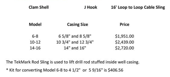 The clamshell pictured is a 8 5/8" unit with a 6 5/8" adapter plate attached. The Rod Sling assembly is rated at a work load of 2,000 lbs. The Clamshell has a release pin that allows the clamshell to be spread apart when the pin is removed and holds the clamshell in place when installed. This feature allows the driller or drillers helper to install the clamshell around the casing and not have to thread it from the end of the casing.