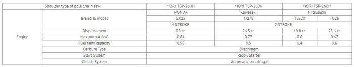 MORI TSP-260 can be powered by either 4-stroke Honda engine or 2-stroke Mitsubishi, Kawasaki engine. The diameter of the aluminum tubes are 26mm + 36mm with maximum length 3.9m, minimum length 2.9m. External anti-slip sleeve helps better for gripping. The overall design perfect is for tree preservation company or frequent tree trimming users. Using 10” length 3/8” pitch Oregon chainsaw for good cutting performance.