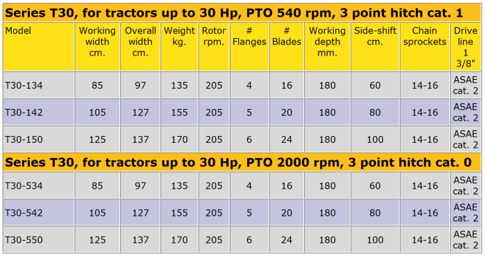 Side-shift rotary tiller. 16-30 Hp (12-22 KW) 540 & 2000 rpm. The built in sideshift mechanism allows the operator to till over the right tractor tire and therefore closer to obstacles. The T30 is available also with a cat. 0 three point hitch & a 2000 rpm gearbox.