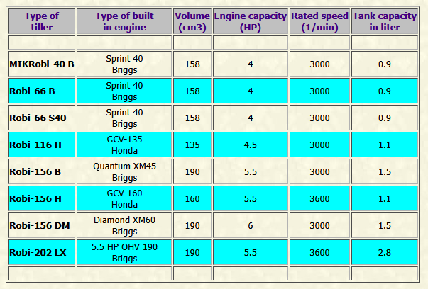 Robi-66 B type: Engine: Briggs, Sprint 40. Capacity: 4 HP. Robi-66 S40 type: Engine: Briggs, Sprint LX40. Capacity: 4 HP. Working width: 300-600 mm.