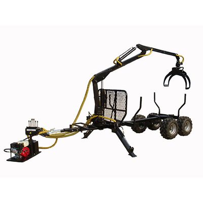 Model: LT1500 Timber Trailer with crane. Max. Reach (mm): 3200. Lifting capacity kgs (1.5m): 300. Max. opening Grapple (mm): 700. Working pressure (Mpa): 20. Pump Capacity: 5.8L/min. Max. load (kgs): 1500. Hydraulic oil tank: 12L. Motor: 6.5 hp. Wheels: 22X11-10.
