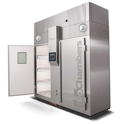 BioChambers’ tissue culture chamber model TCC-74, first in the industry, was specifically designed for facilities with high ceilings, allowing a design which maximizes the available floor space. The chamber features four fixed height light tiers of shelving maximizing the tissue culture area and an open channel floor on each shelf delivering upward airflow to minimize or eliminate condensation in the tissue culture dishes. BioChambers’ tissue culture chambers provide tight uniform control of temperature, lighting using LED lamps, and adjustable airflow.