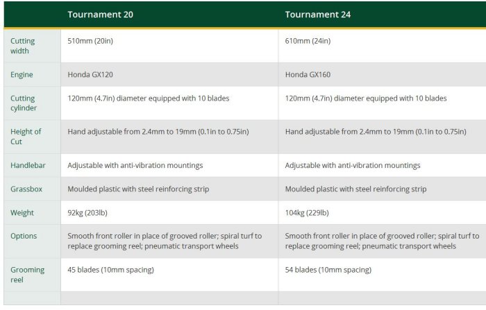 Easy to set and operate, the Tournament is equipped with an integral powered turf groomer that uses thin, closely spaced vertical blades to lift lateral grasses and “runners” immediately in front of the 10-bladed cutting cylinder. The result is a consistently level, true and even finish, meeting the exacting requirements of sports such as bowls, cricket and golf where speed and run of the ball are key. Engineered to operate effectively at low engine speeds the Tournament delivers low fuel consumption, noise levels and vibration. This is the perfect machine for cricket wickets, golf and bowling greens.