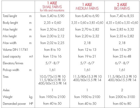 It includes wagons with self-loading chain ladder for small and medium-sized farms, and wagons with self-loading chain ladder for medium and large farms.
