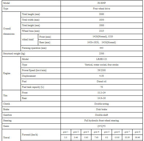 JS-804P tractor use famous engine, lower oil consumption. Full hydraulic steering, excellent steering, small turning radius. Individual reservoir for hydraulic steering and lift system. individuated front wind shield, streamline shape.