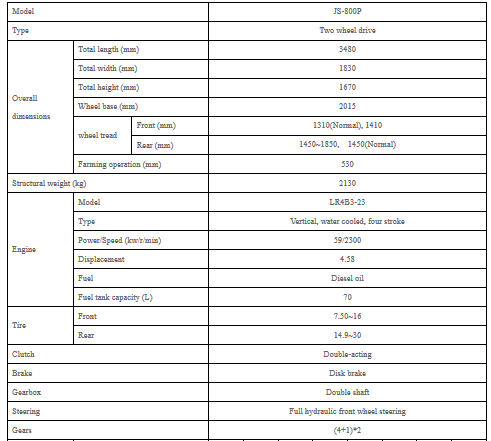 JS-800P tractor use famous engine, lower oil consumption. Full hydraulic steering, excellent steering, small turning radius. Individual reservoir for hydraulic steering and lift system. individuated front wind shield, streamline shape.