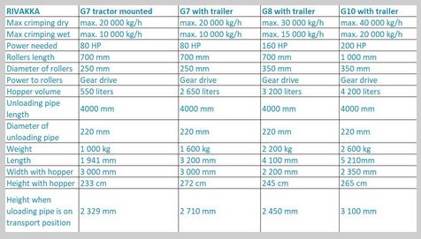 The Rivakka Greenmaker G8 is a tractor-driven roller mill for fresh or dry grain. The mill’s serrated-edged, hardened rollers effciently pull grain inside and carefully crush even the smalled grain. The discharge funnel is made of stainless steel and is prepared for an acidifier. Utilize the advantages of wet preservation at times of high oil prices.