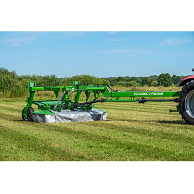 The PRONAR PDC300C disc mower is a modern, trailed machine equipped with a high-performance conditioner, designed for operation in demanding conditions and dense, heavy forage. Its active suspension system ensures perfect three-dimensional ground contour following, providing a clean and uniform cut even on uneven or hilly terrain. The central drawbar allows mowing on either the left or right side of the tractor, increasing operator comfort and working efficiency when covering large areas. The integrated conditioner with spiral steel fingers effectively fluffs and loosens the crop, accelerating the drying process and improving forage quality. PDC300C combines efficiency, precision, and reliability, delivering excellent cutting performance and maximum productivity for professional forage operations.