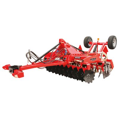 Disc harrow is a compact disc tillage machine. The two rows of offset discs to work the soil are arranged for mixing and breaking of stubble in a single pass. In this tillage type, the disc move is changed with the working depth that is in turn changed by operating the hydraulic coupling height on the tractor: this changes the pressure on the disc, the disc angle to the tillage direction, this also enables a more aggressive cultivation of the discs into the soil. The overall machine is compact and easy to manoeuvre on the field and on the road. The machine is also very convenient in operation. Thanks to a machine this versatile the stubble and harvest residues are thoroughly mixed.Model T-DGT 16 T-DGT 20 T-DGT 24 T-DGT 28