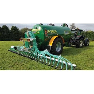 The MAJOR MJTS6430 Slurry Applicator covers an area of 6.4m with 30 outlets. Slurry enters the Vogelsang macerator through the 4” bauer coupling and is distributed through the 40mm outlets. A large capacity sump is located under the macerator which collects debris. It can be cleaned out easily, without the use of tools. The 40mm distribution pipes are finished off with couplings to allow simple maintenanceof the rubber nozzles.The high tensile springs use the high carbon steel coulters to split the grass allowing the slurry to run on the ground. Pneumatic wheels are fitted as standard letting the frame follow the ground contours.