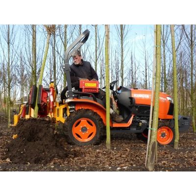 Attachment tree lifter in front of or behind a four-wheel drive tractor. By means of a quick coupler also possible as attachment to Pazzaglia rootball lifter. There are three types of Select tree lifterd, Select-40, Select-50 and Select-80. The Select tree lifters are available with U-blades of 30-80 cm or with flat or bended blades on an arm. The maximum trunk size of the trees to be lift is between 16-18 and 25-30 cm. The capacity that can be achieved is 80 to 120 trees per hour. All mounted tree lifting machines are provided with Damcon clamp shaker.