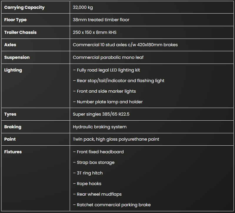 Our tri-axle bale trailers are built on a heavy duty chassis and a sturdy drawbar to give you the perfect towing flat bed trailer. This versatile trailer is great for transporting a variety of things from bales, pallets, bags etc as well as other work equipment within construction. With many optional extras or upgrades you can really personalise your trailer to suit your individual needs. Our Bale Trailers come as standard with our high speed running gear, commercial spec axles and suspension, road legal LED lighting kit which includes a rear number plate holder and lamp.