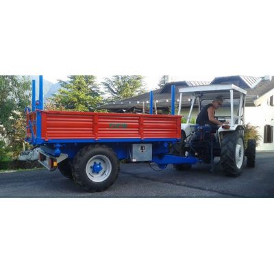 The total mass when fully loaded is 3000 kg. It is a type of trilateral tipping trailer, available in various versions of different sizes with sides and oversides with articulated drawbar to enter the vineyards. Also available with drive axle (traction). In the table below, the versions with the letter "N" indicate free axle, those with "M" indicate motor axle.